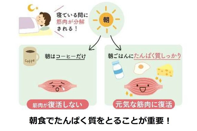 健康なカラダを作るのには、3食同じだけのたんぱく質をとることが必要だ。たんぱく質は体にためておくことができないため、体を動かしたときに体内のたんぱく質が不足していると、筋肉づくりが効果的に行われないからだ。朝・昼・夜のうち特に、「朝」のたんぱく質が重要となる。なぜなら、睡眠中は筋肉が分解され、減り続けている状態だが、朝食でたんぱく質をとることで、1日の筋肉合成スイッチが入るからだ。