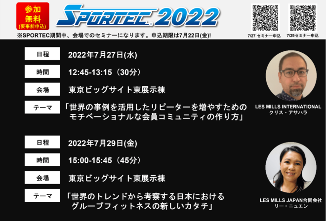 またLes Mills Japan合同会社はSPORTEC2022で2つのセミナーに登壇する。