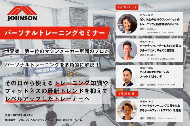 ジョンソンヘルステックジャパンはNESTA(全米エクササイズ&スポーツトレーナー協会)主催の「NESTA パーソナルトレーナーズサマーセッション」に講師として参加いたします。