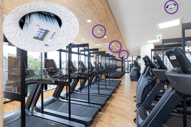 また、多くの人が触れるトレーニングマシンやドアノブだけでなく、床や天井等ありとあらゆる箇所に光触媒コーティングを施しています。