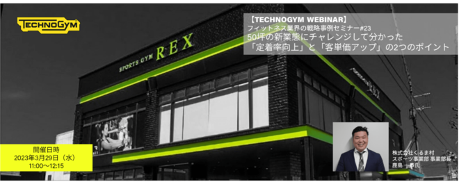 来る3月29日(水)11:00に開催されるウェビナーでは、福岡県のスポーツジムREXのオペレーターを招いて、施設運営を通じて「定着率向上」と「客単価アップ」について得られた2つの知見についてお話を伺います。