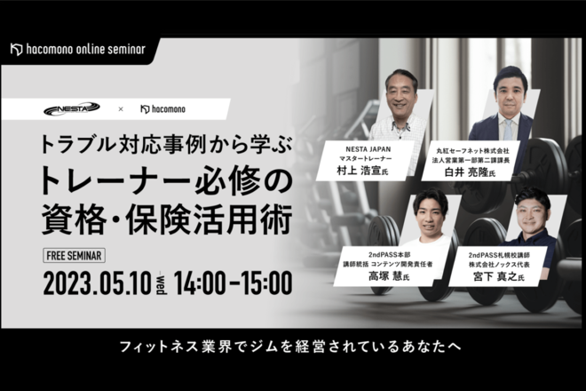 株式会社hacomonoは、「トラブル対応事例から学ぶ トレーナー必修の資格・保険活用術」というタイトルで、無料オンラインセミナーを開催する。
