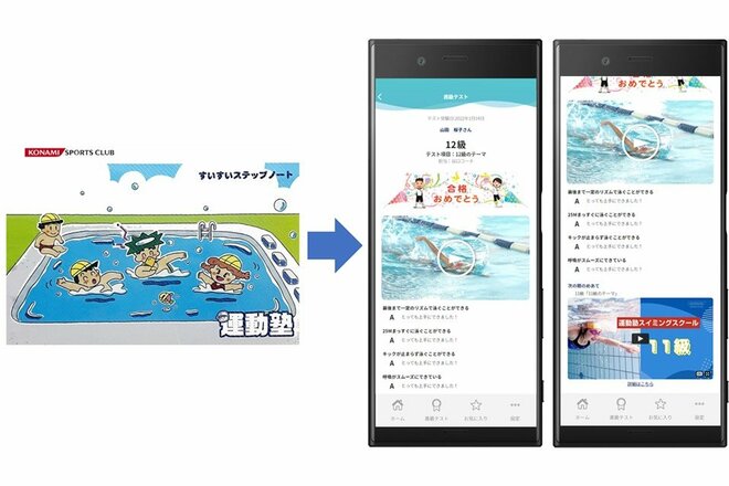 コナミスポーツは、「ほめる型指導」と「段階別指導」を取り入れたキッズスイミングスクールの運営を行い、今年50周年を迎える。現在では「運動塾スイミングスクール」と呼ぶキッズスイミングスクールにて、学校教育でのDX化やコロナ禍における保護者観覧の制限などを背景にスマートスイミングレッスンを活用した「運動塾デジタルノート(以下、デジタルノート)」の導入を始めた。