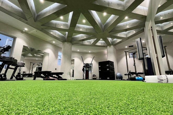 ジム全体は緑の人工芝が敷き詰められ、真ん中に広いスペースを設けている。パワーラック、可変式ダンベル、ケトルベルなどのウェイトトレーニング器具よりも、KEISERやメディシンボール、ジャンプボックスといったファンクショナルトレーニング器具を中心に配備している。