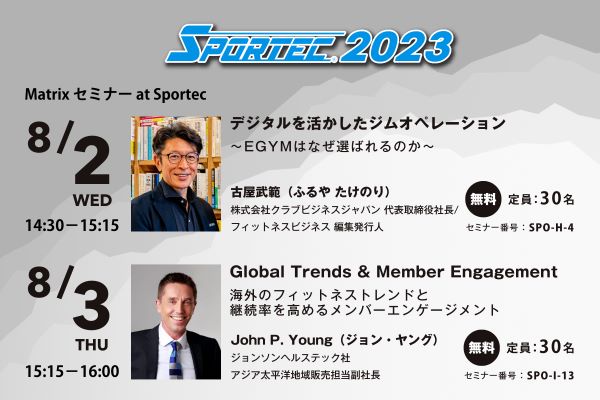 ジョンソンヘルステックジャパン株式会社では、Sportec 2023の会期中に以下のセミナーを開催する。海外の最新フィットネストレンドの紹介や、多くのクラブにとって長年の課題である「メンバー継続率」「新規会員獲得」など、情報盛りだくさんの内容でお届けする。