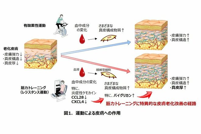 有酸素性運動と筋力トレーニングは、どちらも皮膚老化の指標である皮膚弾力性と真皮構造を改善し、その機序として運動による血中成分の変化が皮膚の重要な層である真皮の細胞外基質を増加させることを明らかにした。