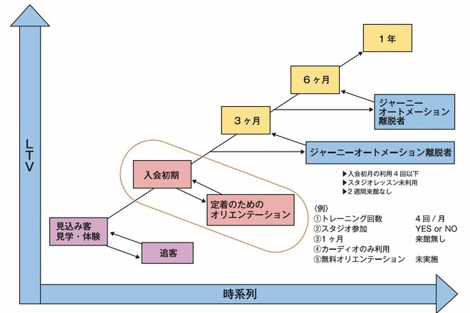 多くのクラブでは、入会獲得方法に力を入れ、時間をかけているだろうが、メンバーにとっては、入会前の期間よりも入会後の期間のほうが長い(はずだ)。入会しても離脱しやすいモデルでは、経営・現場もろともビジネスとして持続性に欠けてしまう。入会を獲得することも大切だが、今あるリソースをフル活用しながら、初心者を離脱させないよう、仕組み化することで、退会率が1%でも下がったとしたら?もしくは、在籍が数ヶ月伸びたら?クラブの価値に気づいてオプションを付帯するようになったら?それだけでもビジネスは大きく改善する可能性があるだろう。
