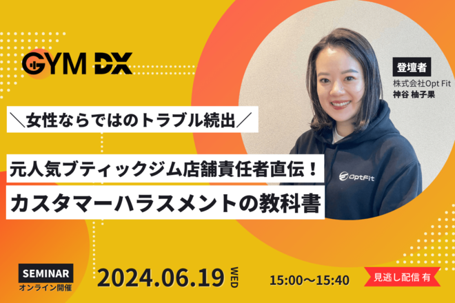 本セミナーでは同社の神谷柚子果氏が、ブティックジムの店舗責任者として顧客対応を行っていた経験から、予防策や対応について、事例を交えながら解説する。カスタマーハラスメントへの適切な対処によって、従業員の労働環境を守り、ジム経営を強化することが可能、と同氏は話す。