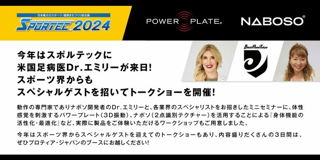 また、「パワープレートパルス」と「ナボソ」の製品を特別価格で販売しますので、ぜひブースまで足をお運びください。