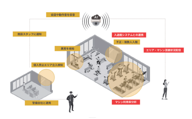 AIを活用した防犯カメラで、ジムの安全管理と運営管理をDXする「GYM DX 」。リリースから、3年間で1,500以上のフィットネス施設に導入。2024年には、介護施設での実証実験もスタートし、AIによる「転倒検知」が可能になる。その他にも、注目の新機能「収音カメラ」「双方向通話カメラ」により、安全管理機能が拡張され、オペレーション改革により、スタッフの業務改善や生産性向上など、クラブの体験価値向上へと繋げられる環境が実現する。