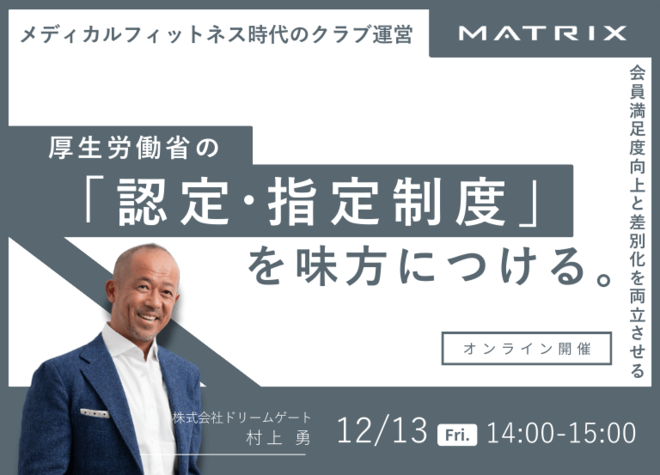 世界100カ国以上で販売を行うマシンメーカーの日本法人「ジョンソンヘルステックジャパン株式会社」は、株式会社ドリームゲート代表取締役社長である村上勇氏をスピーカーに招き、12/13(金)に無料ウェビナーを開催する。
