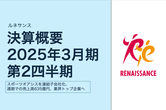 株式会社ルネサンスの2025年3月期第2四半期の決算(連結)は、売上高313.67億円(全年同期比48.3%増)、営業利益8.74億円(同210.2%増)、経常利益4.68億円(同118.9%増)、純利益2.22億円(同47.5%増)となった。