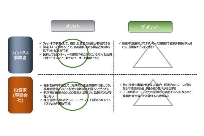なお、フィットネス事業者にとっては、投資家がマシンを次のオーナーへ転売するなどのリスクも考えるであろうが、リース終了時にはリース先(フィットネス事業者)による買取オプションが付与されるなど、運営事業者のリスクを保護していく。