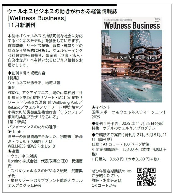 株式会社クラブビジネスジャパン(本社:東京都渋谷区、代表取締役 古屋武範)は、ウェルネス産業の未来を拓く経営情報誌として「Wellness Business」を2025年11月に創刊する。国内唯一のウェルネス業界専門誌として、施設開発・サービス革新・地域創生など多角的な視点から最新動向を分析。持続可能な社会の実現を目指す事業者に向け、世界の先進事例や市場トレンドを紹介する。本稿では、今後「Wellness Business」でも注目する、経済効果の高いウェルネスビジネスの着眼点についてまとめる。