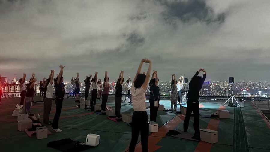 ヨガ講師による充実のプログラムは、夜景や夜の空を仰ぐ場面も多く、自身と向き合いながら体をゆったり動かしてリラックスし、就業後のリフレッシュになったのではないだろうか。