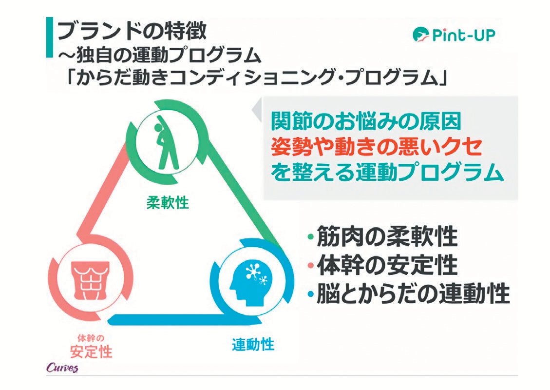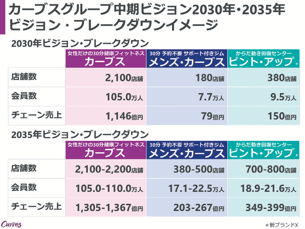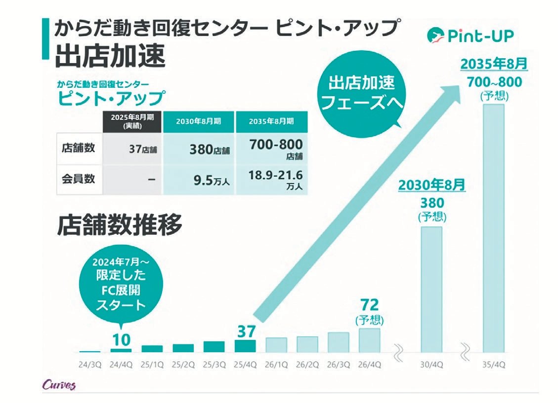 女性カーブスは、既存店を中心に、さらなる成長余地があるため、これを追求。さらに、ブランドXとして、この間、実験ドリブンでビジネスモデルの確立に取り組んできた新業態、からだ動き回復センター「ピント・アップ」が、多店舗展開を進められる段階にまで到達。26年8月期以降、多店舗化を目指す。