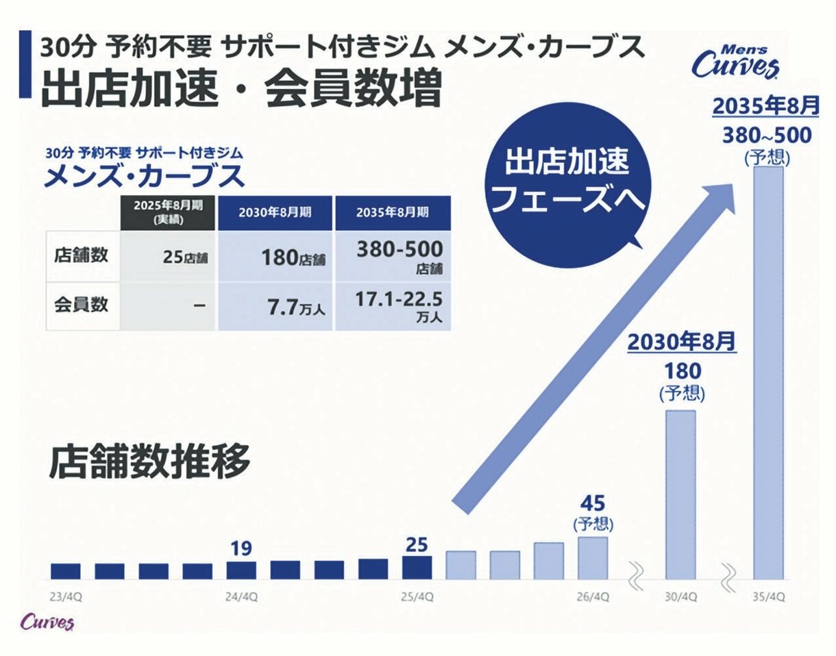 2025年8月期におけるカーブスの店舗数(女性カーブス)は1996店(前年同期比18店増)、会員数は86.3万人(同4.6万人増)、チェーン売上高は、856億円(同5.7%増)を達成。うち、プロテインなどの会員向け物販売上高は、230億円となった。また、同社の売上高は375.6億円(同5.9%増)、営業利益は63.4億円(同16.2%増)、当期純利益43億円(同20.6%増)となった。チェーン売上高、同社売上高、利益は、過去最高となった。
