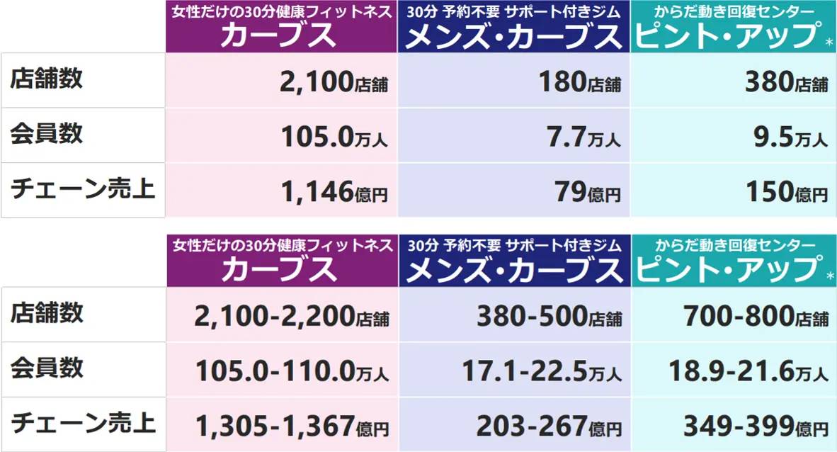 「女性だけの30分健康フィットネス カーブス」では、「病気と介護の不安と孤独のない生きるエネルギーがあふれる社会」の実現を目指し、全国に2,001 店舗(2025 年 11 月現在)を展開し、40〜70代を中心に91.5万人(2025年10月末日現在)の会員をサポートしている。また、地域からの要望に応じて「30分 予約不要 サポート付きジム メンズ・カーブス」の展開を進め、全国32店舗(2025年11月現在)を運営している。
