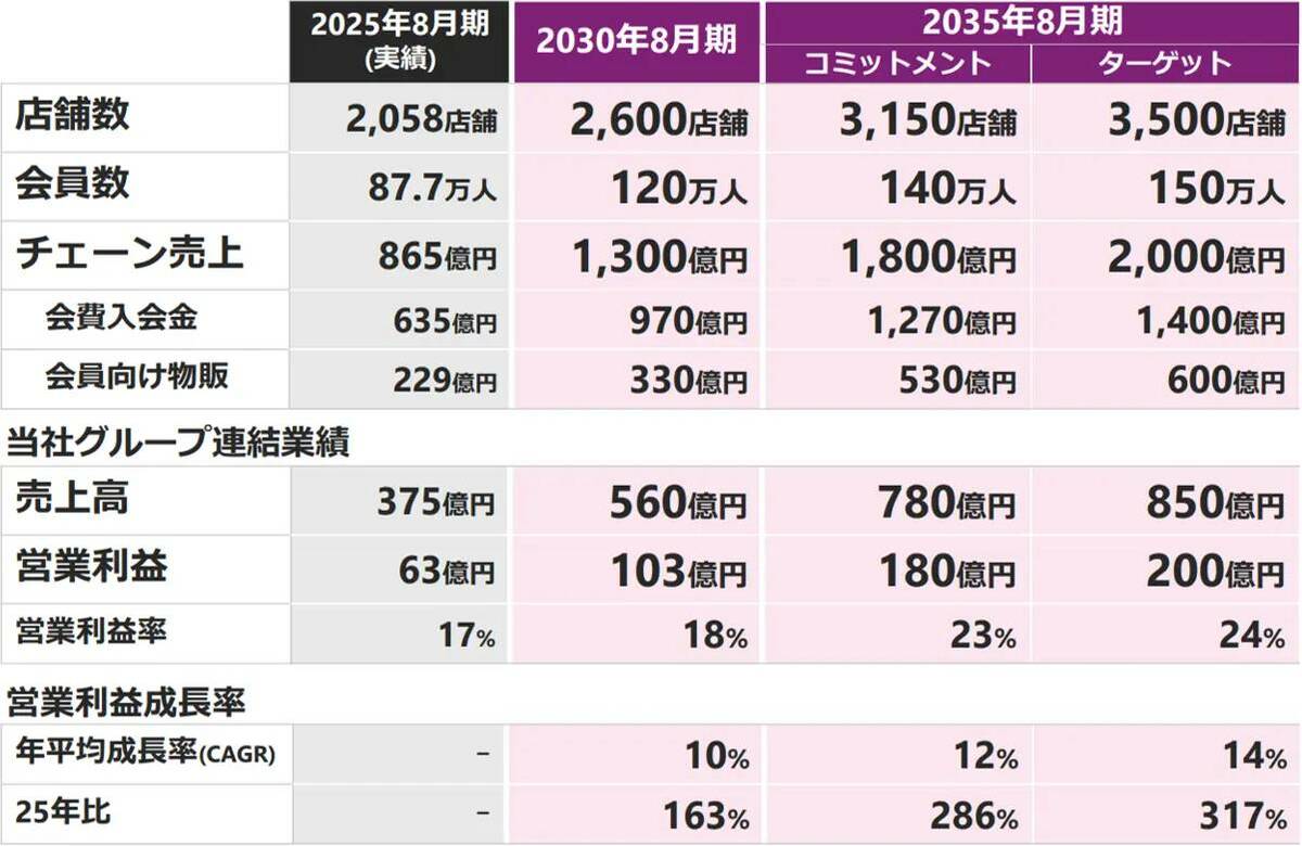 2030 年2,600店120万会員 営業利益100億円、2035年3,500店150万会員 営業利益200億円へ