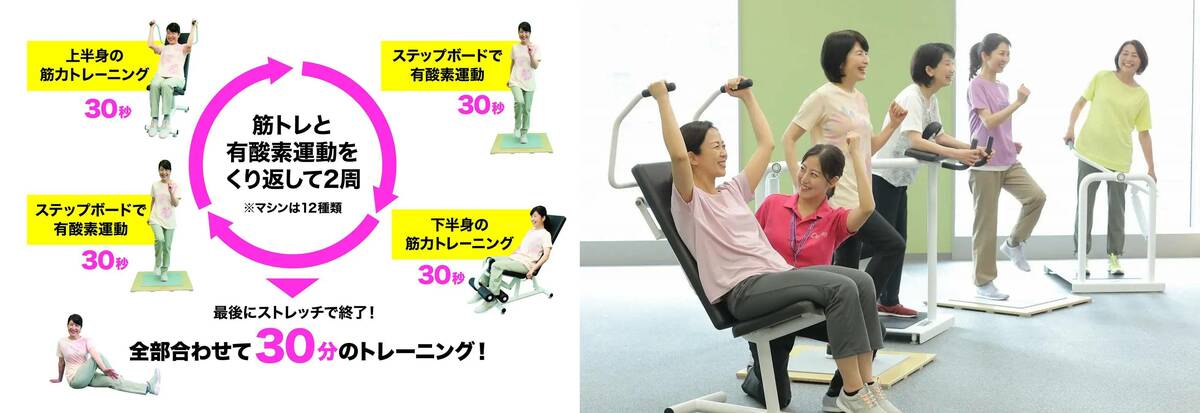 カーブスの運動は、健康づくりに必要な3つの運動「筋力トレーニング」「有酸素運動」「ストレッチ」を組み合わせ、1回30分間で全身を鍛えられるサーキットトレーニングだ。独自に開発した油圧式マシンを使用し、一人ひとりの体力や筋力に合わせて簡単に強度を調節できるため、安全かつ効果的に運動することができる。