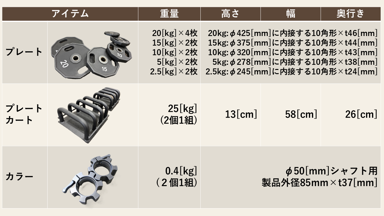 ・プレート(20kg×4、15kg×2、10kg×2、5kg×2、2.5kg×2)