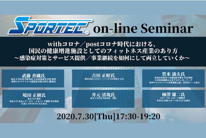 7月30日(木)のSPORTECオンラインセミナーでは、6名の講師をお招きしwithコロナのニューノーマルな時代において、感染予防対策を施しながら、社会生活ならびにスポーツ産業、フィットネスクラブが地域の人々の健康とつながりを作るインフラとして機能し、今後どのように事業継続を進めていくのか、それらを如何にして国民的コンセンサスを得て社会施策に反映させていくかという視点で、講演ならびに対談を行っていく。