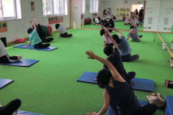 富山県射水市にある、いみずスポーツクラブは、ジム内に広々としたグリーンエリアを設けショートレッスンを展開すると同時に、スタジオでもコンディショニング系のプログラムを多数展開している。
