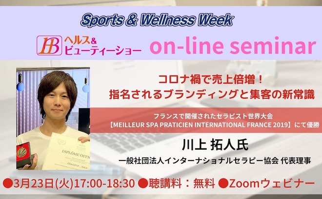 記念すべき第一回目となる今回のオンラインセミナーは、フランスで開催されたセラピスト世界大会【MEILLEUR SPA PRATICIEN INTERNATIONAL FRANCE 2019】にて優勝の実績を持つ、世界一のセラピスト 川上拓人氏を講師としてお招きする。