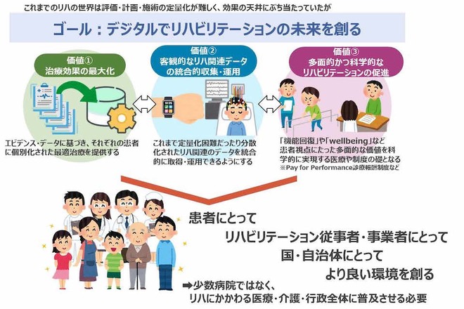 そうした維持期のリハビリの限界の背景にあるのは、専門職員の有無だけでなく、属人的でアナログなサービス提供の現状にもあると考えられる。そこで個々の患者の特性やリハビリの内容とその効果を定量的にデータ化(=デジタル化)することにより、科学的で効果的なリハビリが実現できることが期待される。