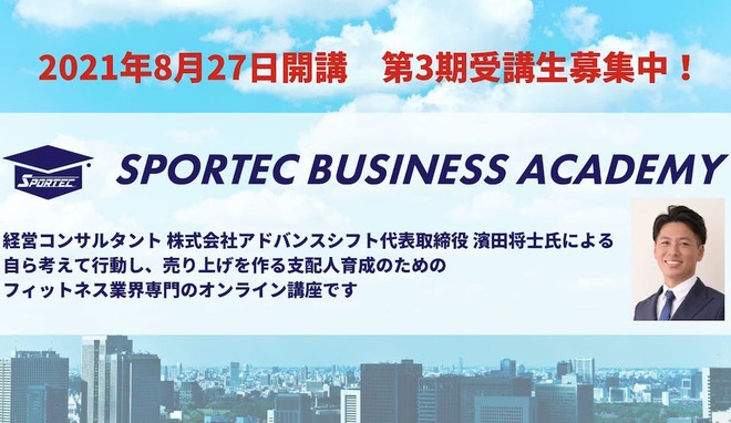 SPORTEC BUSINESS ACADEMYは、展示会SPORTECを運営するTSO International株式会社とフィットネス・スイミング業界で日本一の業績を持つ濱田 将士氏が経営するコンサルティング会社、株式会社アドバンスシフトの2社で開講する、フィットネス業界専門のアカデミー。