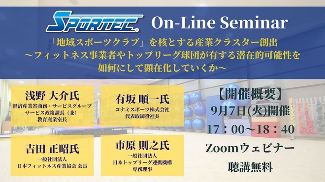 今回のシンポジウムでは経済産業省が主催する「地域×スポーツクラブ産業研究会」の第1次提言を基に、フィットネス事業者/トップリーグ球団にとって、どのような事業機会があるのかについて業界団体のトップを交えてディスカッションを行う。