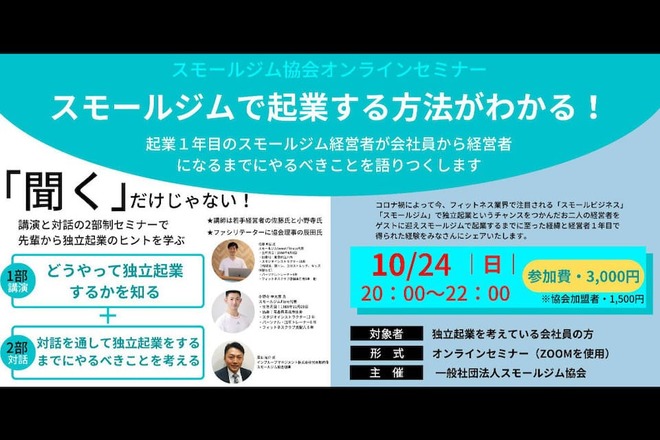 一般社団法人スモールジム協会が、10月24日(日)にオンラインで起業セミナー&パネルディスカッションを開催する。テーマは「スモールジムの起業」。
