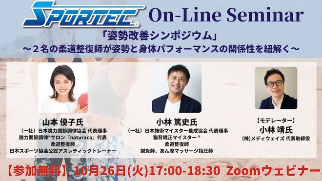 そこで、本セミナーでは、猫背矯正の専門家として著書多数の小林 篤史氏と、独自の整体技術でゴルファーの飛距離を15ヤード伸ばす山本 優子氏を講師に迎え、それぞれの活動について講演と、パネルディスカッションにより、姿勢改善が及ぼす身体パフォーマンスの向上とその理由を探る。