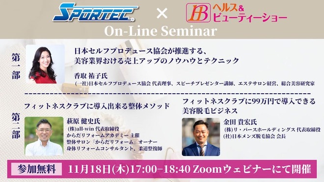 今回のオンラインセミナーは、美容業界の第一人者をお招きし、二部構成として開催し、美容市場を取り込むことでのフィットネスクラブでの新しい売上拡大のヒントを探っていく。