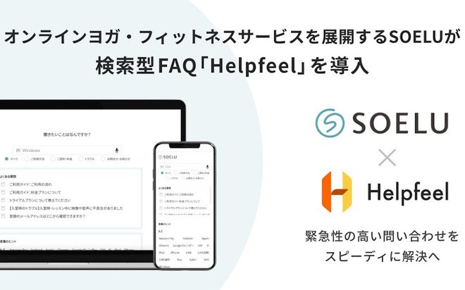 Nota株式会社が、SOELU株式会社が展開するオンラインヨガ・フィットネスサービス「SOELU」(以下、「SOELU」)に、ユーザーのどんな質問にも答える革新的な検索型FAQシステム「Helpfeel(ヘルプフィール)」(https://helpfeel.com/)を導入した。