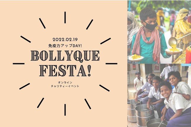 オンラインで行うボリウッドフィットネス「BOLLYQUE」gくぁ、クラウドファンディングサービス「キャンプファイヤー」にて、2022年2月19日(土)にチャリティーイベント「BOLLYQUE FESTA !」を開催。「免疫力アップ!」をテーマにヨガ、アーユルヴェーダ、インドカレー料理教室、ボリウッドフィットネスなどのレッスンをオンラインで体験可。収益の一部はインドで貧困層への食糧支援を行う、“世界最大の給食センター”「アクシャヤ・パトラ」の活動に充てる。