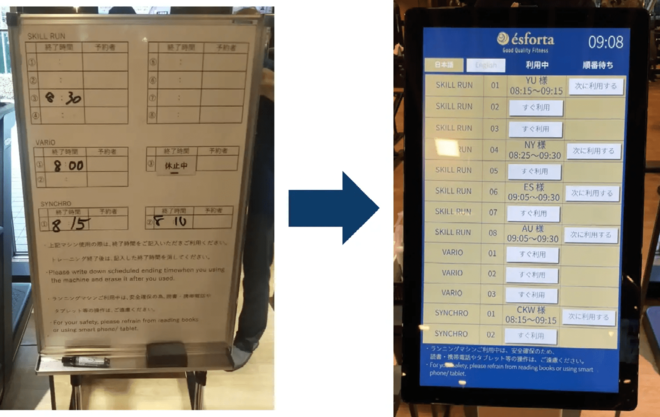 従来は手書きのホワイトボードを使って管理していたが、デジタルのタッチサイネージに変更したことにより、利用者はタッチ操作で利用時間の入力や順番待ちの登録をすることができる。