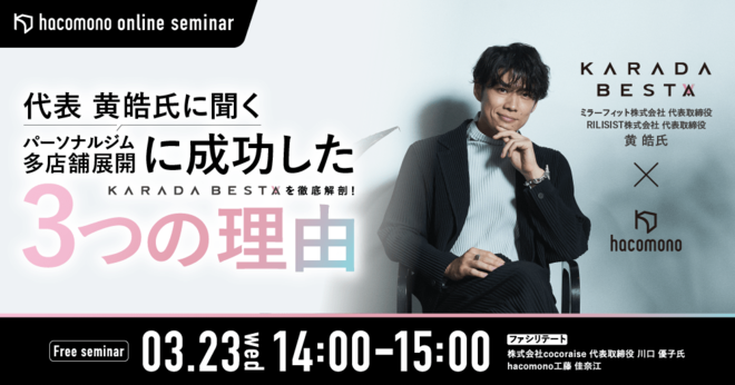 月謝制サブスク店舗のための次世代会員管理・予約・決済システム「hacomono」(https://www.hacomono.jp)は、2022年3月23日(水)にKARADA BESTA 代表 黄皓氏が登壇する、無料セミナー「パーソナルジム多店舗展開に成功した3つの理由」をオンライン開催する。
