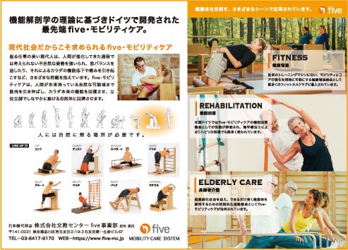ドイツで腰痛改善のために開発された「five・モビリティケア」は、ストレッチとコアトレーニングそれぞれの刺激を同時に身体へ作用させることにより、モビリティとコアを統合的に改善・強化する革新的なメソッドである。従来のコンディショニングの概念を大きく変え、QOLの向上を実現する。